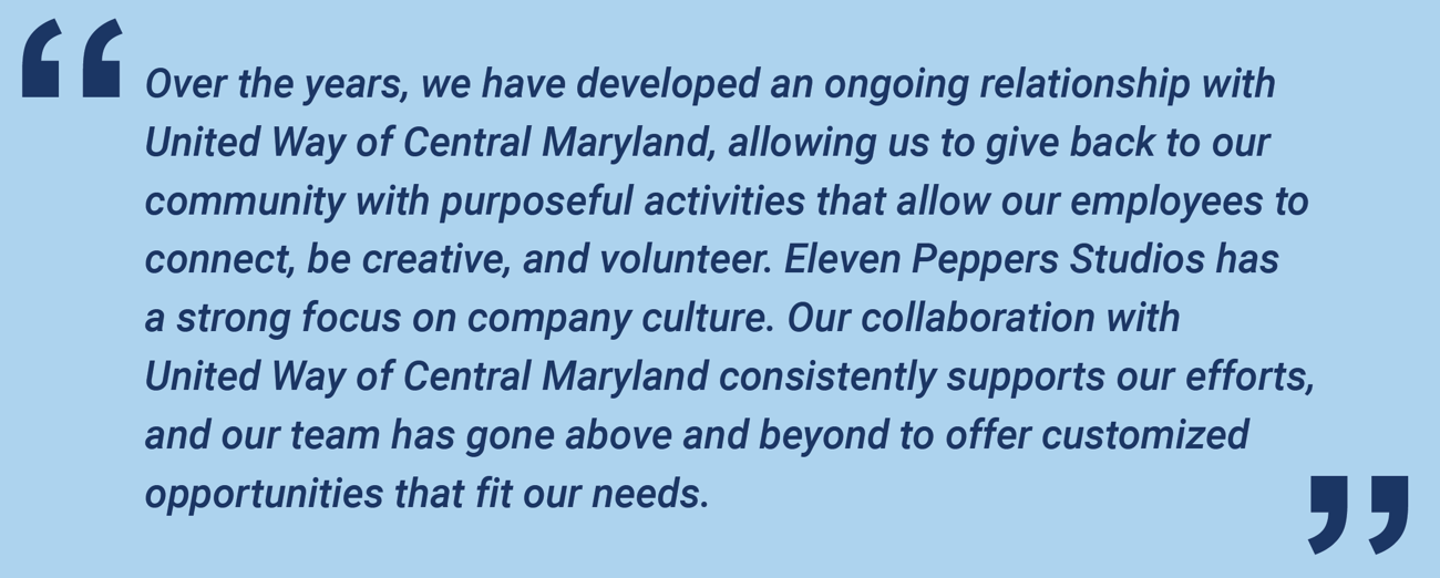 Earlier this year, Eleven Peppers Studios participated in United Way's Volunteer To Go program, creating a customized experience for their team's family-friendly event. The assembled items were then distributed to support an event at our Columbia Family Center in Howard County.